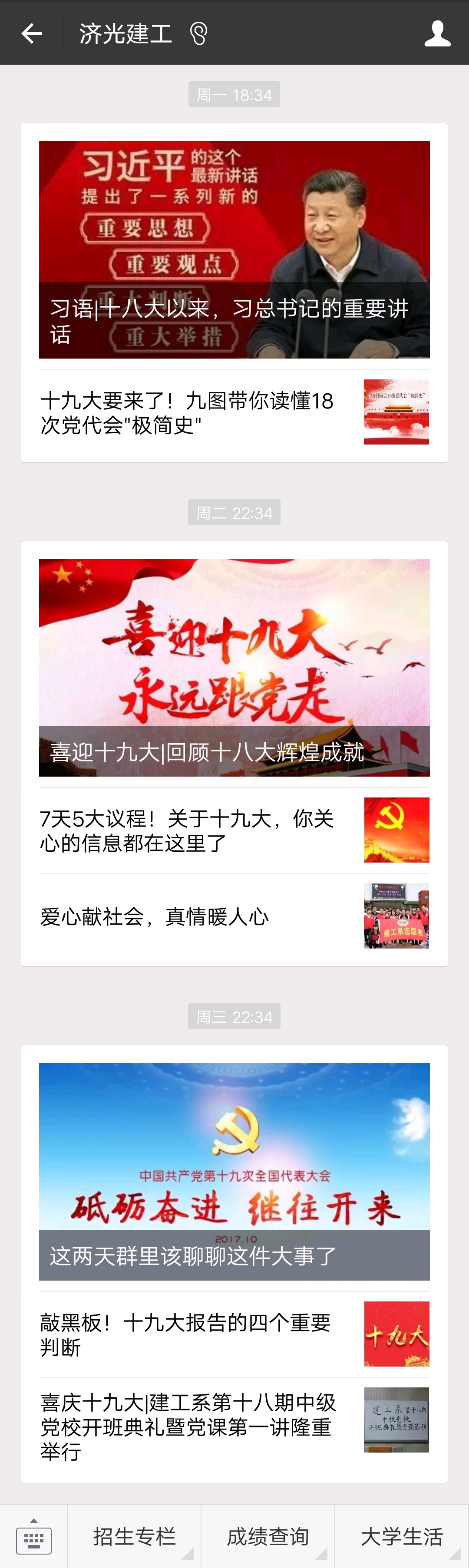 宣传工作是每项活动开展的重要组成部分。我系利用微信公众平台作为弘扬正能量和发布重要内容的新媒体阵地。从回顾十八大到十九大第一次会议解读,建工系微信公众号一直都将党的政策及思想及时、准确传递给每一位教师与同学。