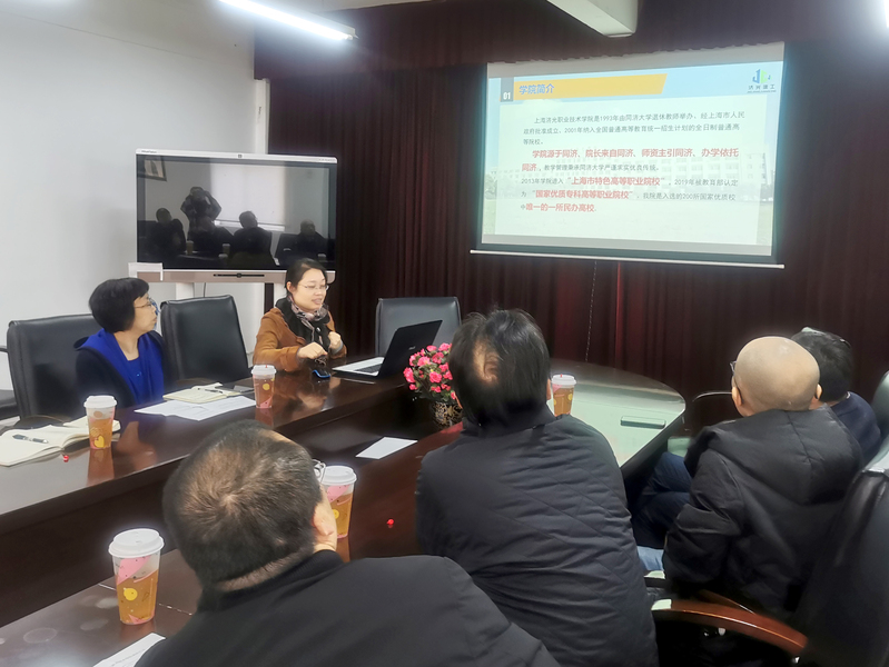 交流环节,胡展飞院长首先对中侨大学建筑工程学院老师们的到来表示热烈的欢迎,给来访的老师们详细的讲解了我院的办学定位和发展规划,对于中侨大学建筑工程学院提出的高本贯通项目表示支持。瞿丹英介绍了建工系的发展定位和规划、人才培养模式的改革与创新、产学研合作教育和应用型人才培养、师资团队发展规划;葛东霞对特色专业进行了详细介绍;顾惠明对实训室建设与管理进行了详细的介绍;马红丽对高本贯通进行详细介绍;王丽对技能赛做法和成功经验进行了分享;谭春花对建工系党建、学工发展进行了分享。