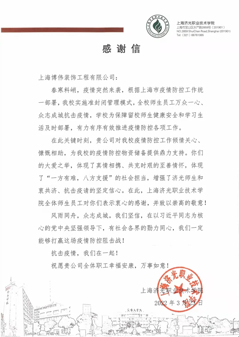 为支持我校疫情防控工作,以实际行动助力留校师生健康安全和学习生活,建工系2019届工程造价专业毕业生施俊的家长,上海博伟装饰工程有限公司向我校捐赠防疫物资款。
