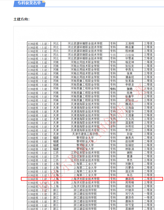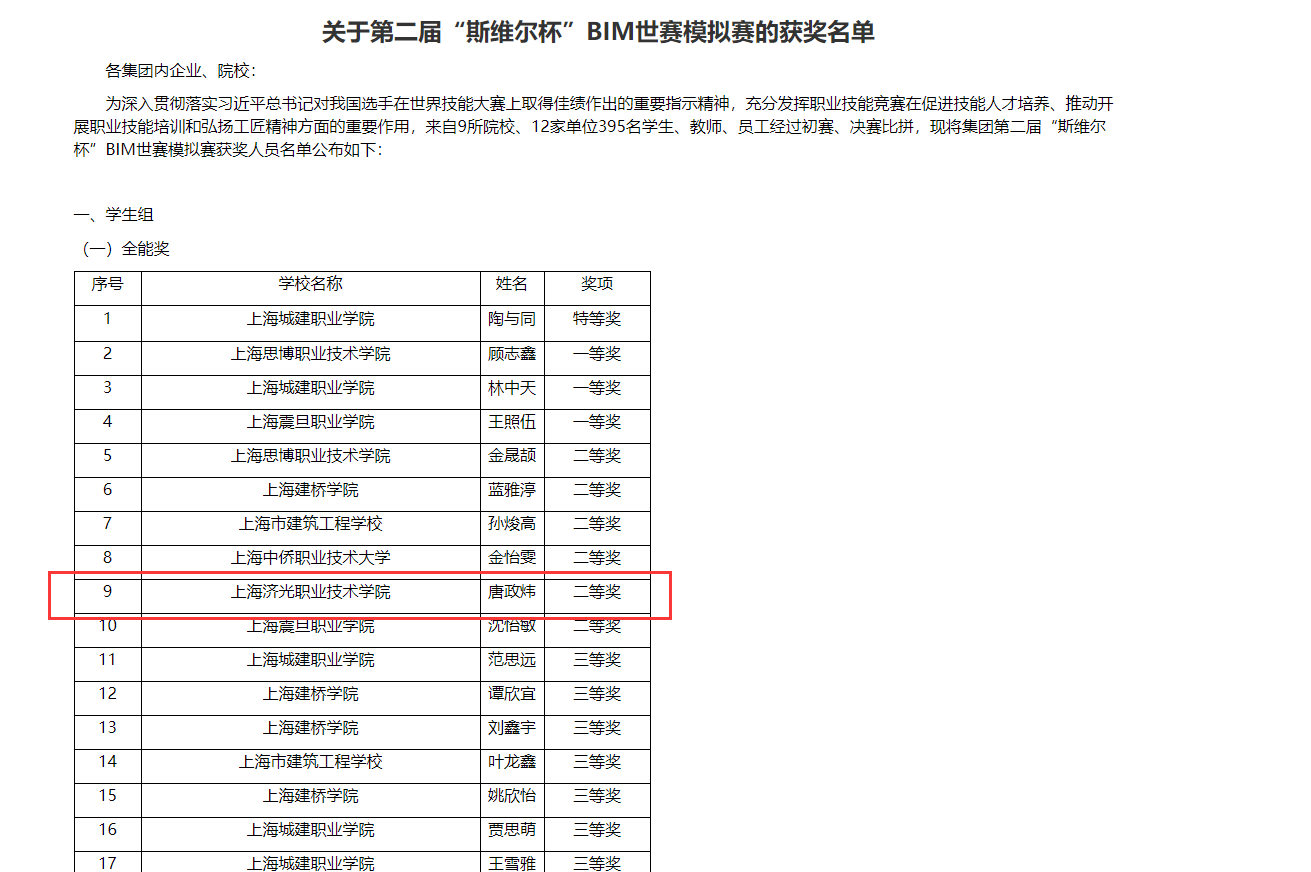 建筑工程学院20级智能化工程技术专业唐政炜同学在2022~2023第一学期顶岗实习期间,积极参加学校方以及实习单位方的比赛,参与多个赛项,在实习单位中森建筑与工程设计顾问有限公司企业带教老师王思凡与学校实习带教老师俞嘉的指导下获得了多个奖项,获奖如下:
