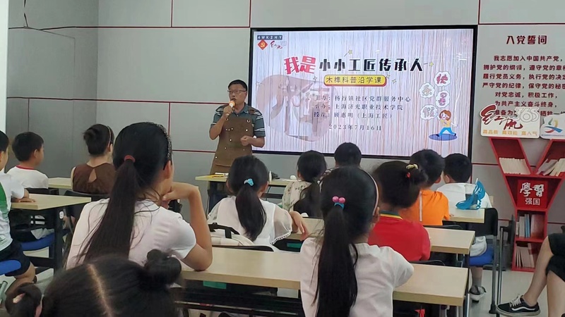 为庆祝中国共产党成立102周年,唱响新时代中国特色社会主义时代主旋律,传承红色基因,赓续红色血脉,展示新时代好少年迈向建设社会主义现代化强国新征程的精神风貌。7月16日下午,我校关工委指导团成员“五老”之一、“上海工匠”、上海市教育系统关工委先行先试基层组织、木工大师工作室负责人顾惠明为杨行镇社区党群服务中心的小朋友了带来了木艺体验课——摇菱。建筑工程学院党支部书记刘夏虹老师、实训员郁勇勇参与了授课。本次课程有19组社区家庭报名参加。