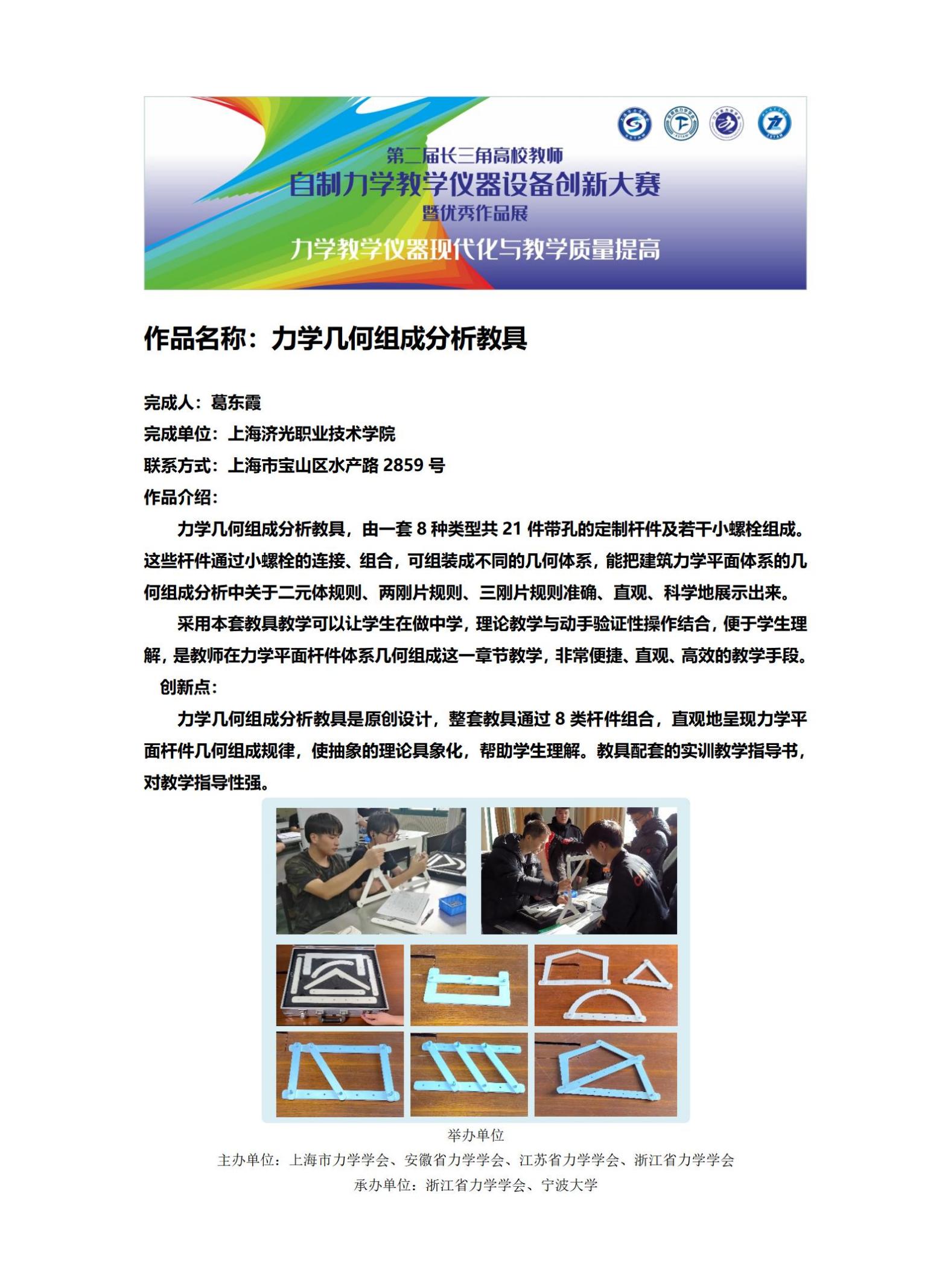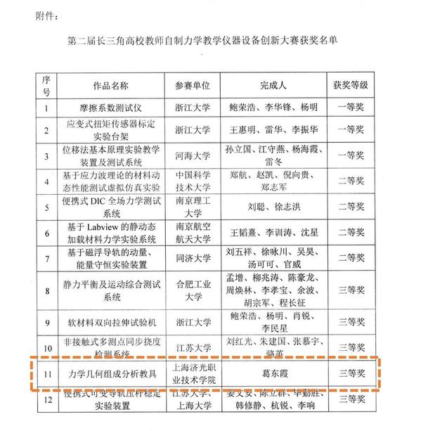 我校建筑工程学院葛东霞老师设计的力学几何组成分析教具荣获第二届长三角高校教师自制力学教学仪器设备创新大赛三等奖。