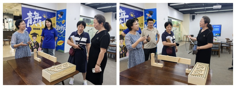 两校就高本贯通课程的教学内容和教学手段进行了充分探讨,杉达学院展示了教师自己研制开发的教具,并向济光学院“上海工匠”顾惠明大师请教改进工艺,与济光学院建筑工程学院副院长葛东霞交流了教具研发的细节,探讨学生毕业实习成果和实训教学内容安排。此外,杉达学院教师还参观了济光学院建筑工程学院的木工实训室暨“顾惠明大师工作室”,对陈列室中顾大师制作的精美工艺品赞不绝口。