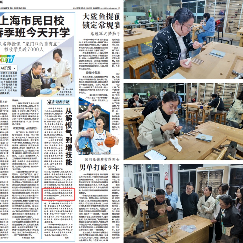 2026年4月13日,上海市民艺术夜校春季班正式开班。我校城市空间数智学院木工大师工作室作为新增课程正式加入市民夜校项目,推出《榫卯结构与木艺课程》特色项目,受到社会广泛关注。相关情况获《新民晚报》报道,彰显学校服务社会、传承中华优秀传统文化的责任担当。